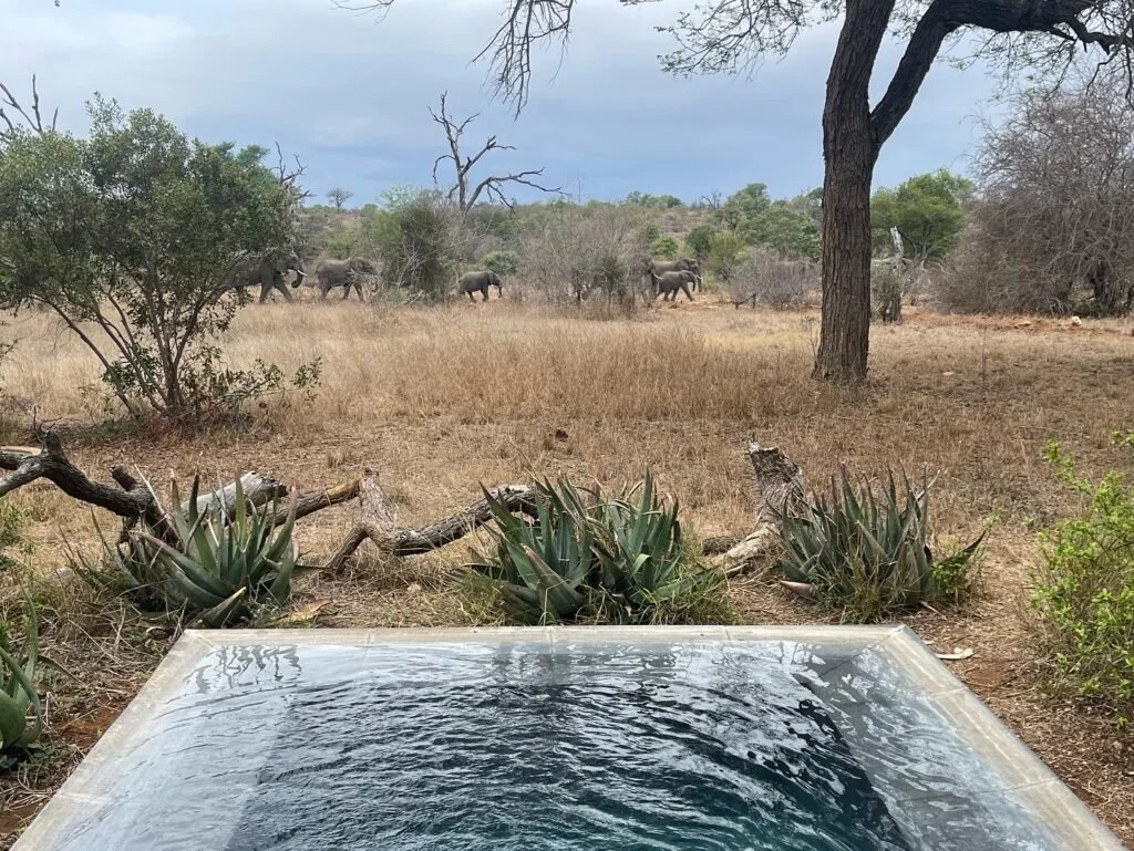 We sat down for lunch and were treated to a 3 course meal out on the patio, and I guess the elephants go the memo too as they were right on time; a massive herd strolled up to the waterhole in front of us to have their mid-afternoon drink. (There is a low electric fence around the camp for guests safety). After lunch ,while I was cooling off in my private pool, the elephants headed off on their way back into the African bush.