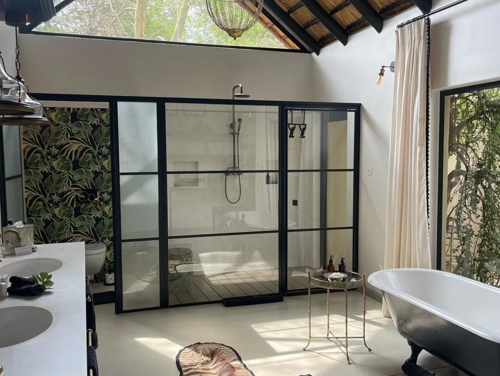 The bathroom has both an inside and outside shower, so you can hear all the sounds of the African bush while enjoying the privacy of the outdoor shower.
