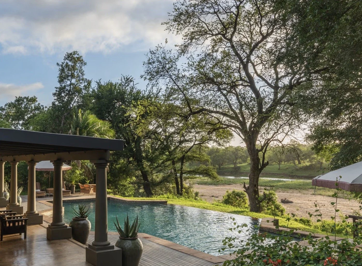 Kirkman’s Kamp – is a historic lodge offering a charming 1920s homestead atmosphere with spectacular views over the Sand River. Kirkman’s Kamp is known for its warm hospitality, excellent guiding, and classic safari charm